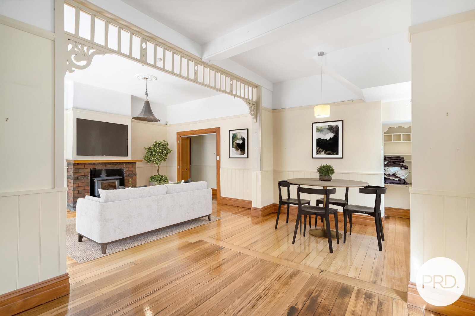 Set back from the road and looking pretty as a picture with a white picket fence, this red brick home welcomes you with a wide front porch enticing you to explore further. Step inside to discover rows of vintage stained-glass windows complementing the timber floorboards, soaring ceilings and ornate fretwork, evoking ageless charm throughout.