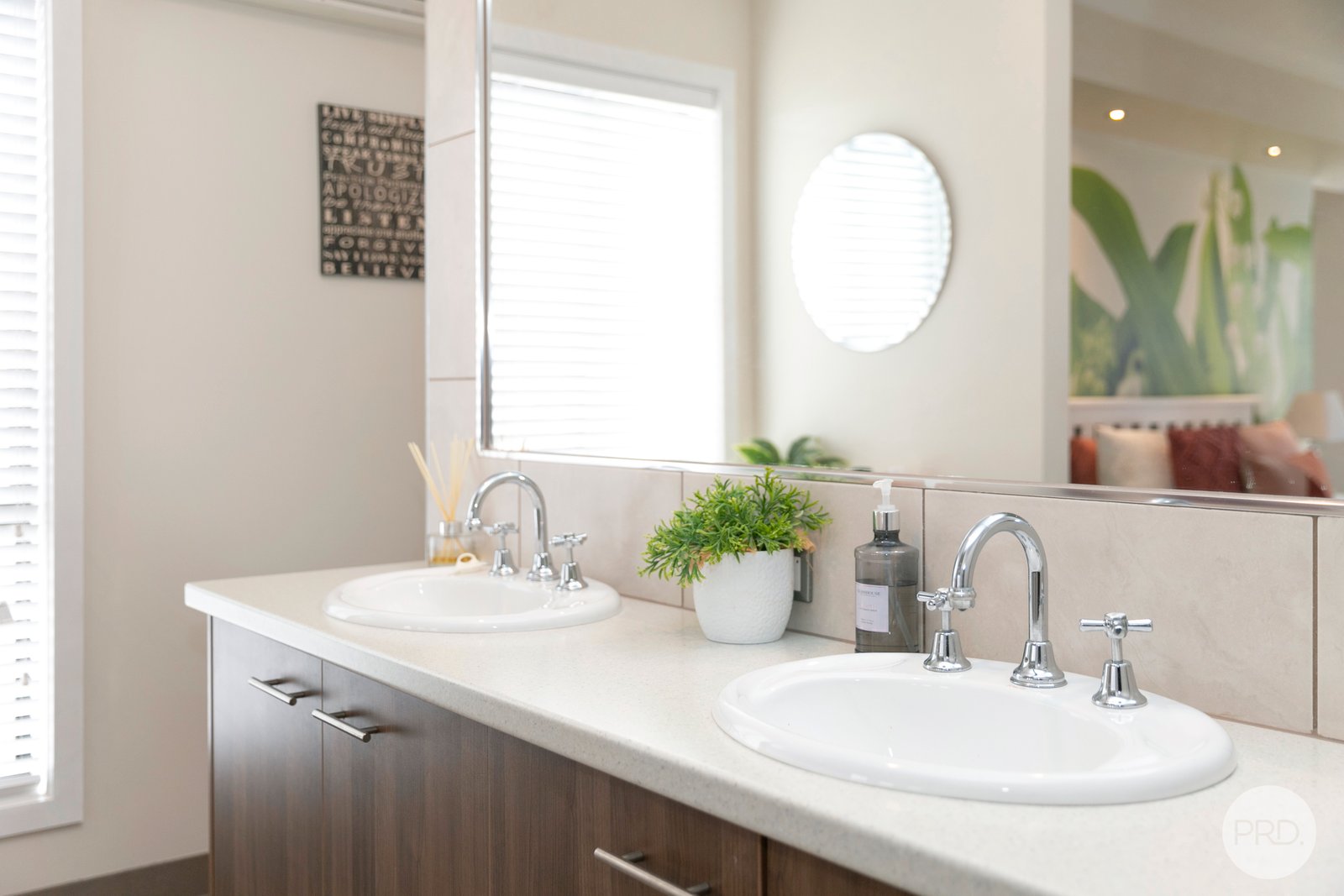 The master bedroom is designed with a burst of style with dramatic mural wallpaper beneath an overhead bulkhead, along with a double entry walk in robe and a double vanity ensuite with spilt system comfort.