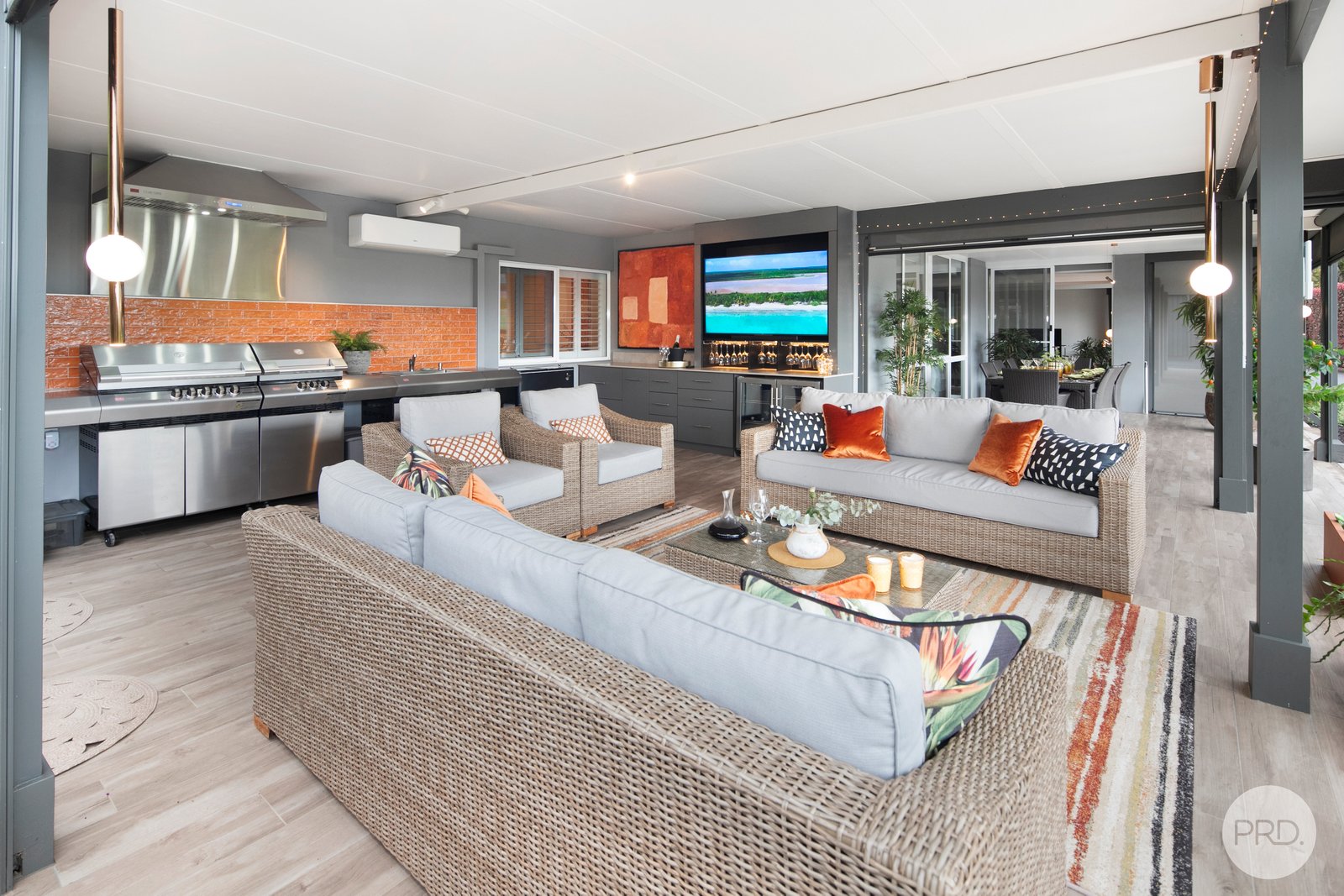 The ultimate entertainer's space, the enclosed patio includes built-in BBQs, a full bar with fridges, lounge and dining zones, a split system for year-round comfort, and Zip Track blinds for privacy and weather protection.