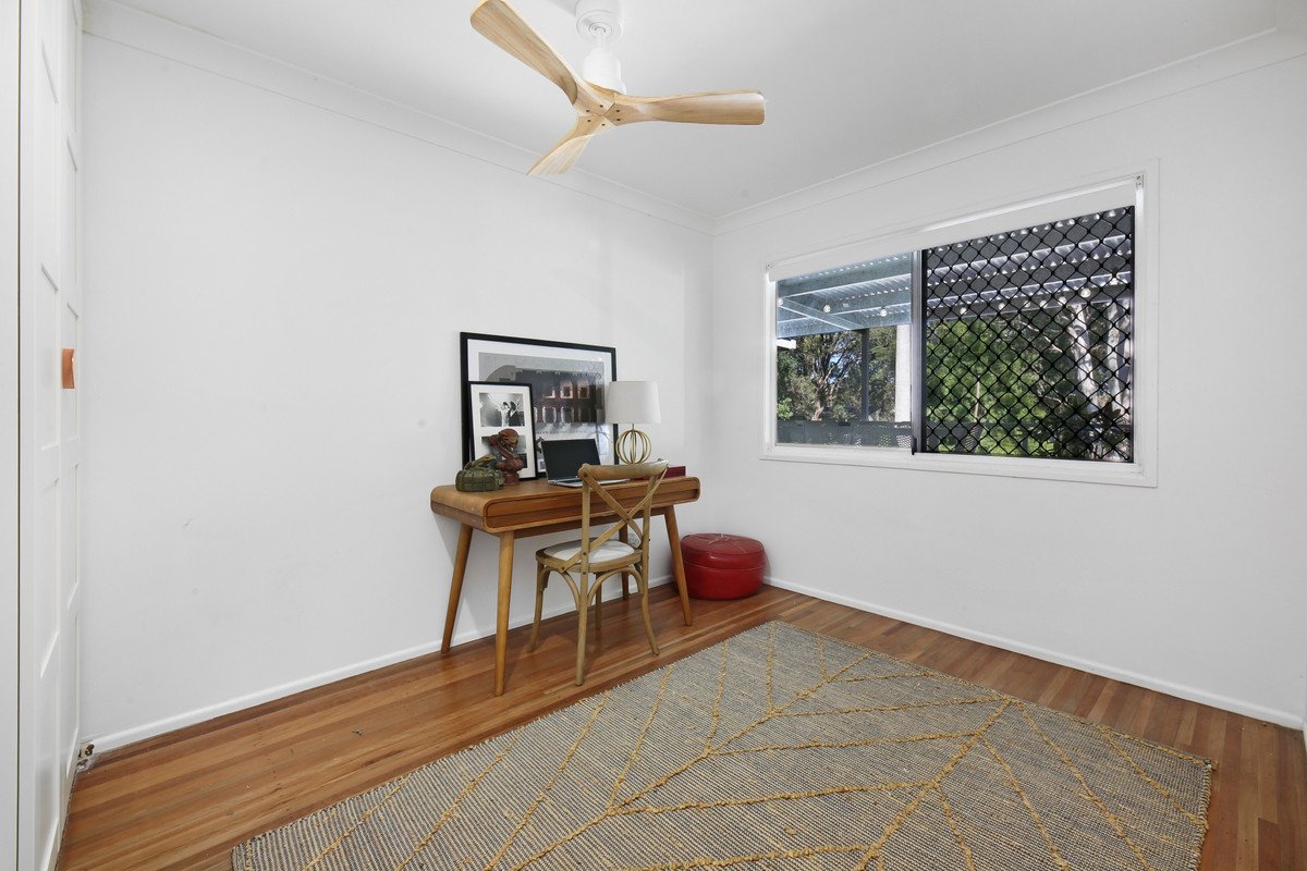 Two additional bedrooms overlook back deck featuring timber floors, coastal fans, and BIR